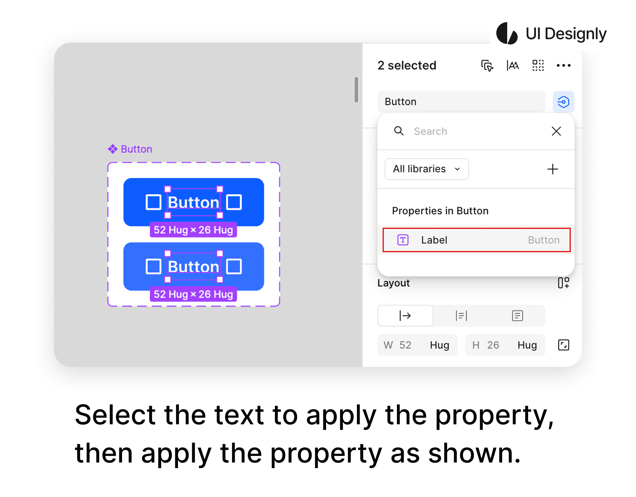 The Text property allows you to edit the text content directly from the instance without needing to go into the master component. This is very suitable for elements like button labels, titles, subtitles, prices, etc. This feature allows designers to change content flexibly while maintaining the standard structure and style of the component.