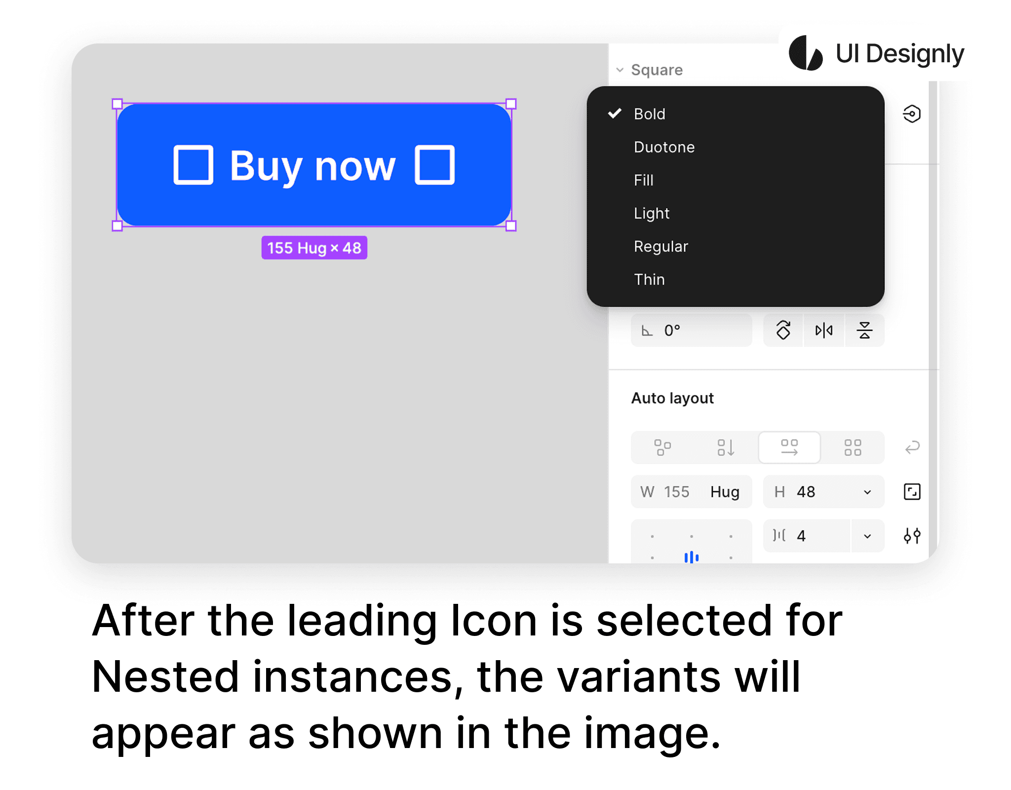 To apply this “Swap Instance” to the button's icon, first select the icon you want to apply as shown, then click on the “Apply Instance Swap Property” icon and select “Icon leading swap” to finish.