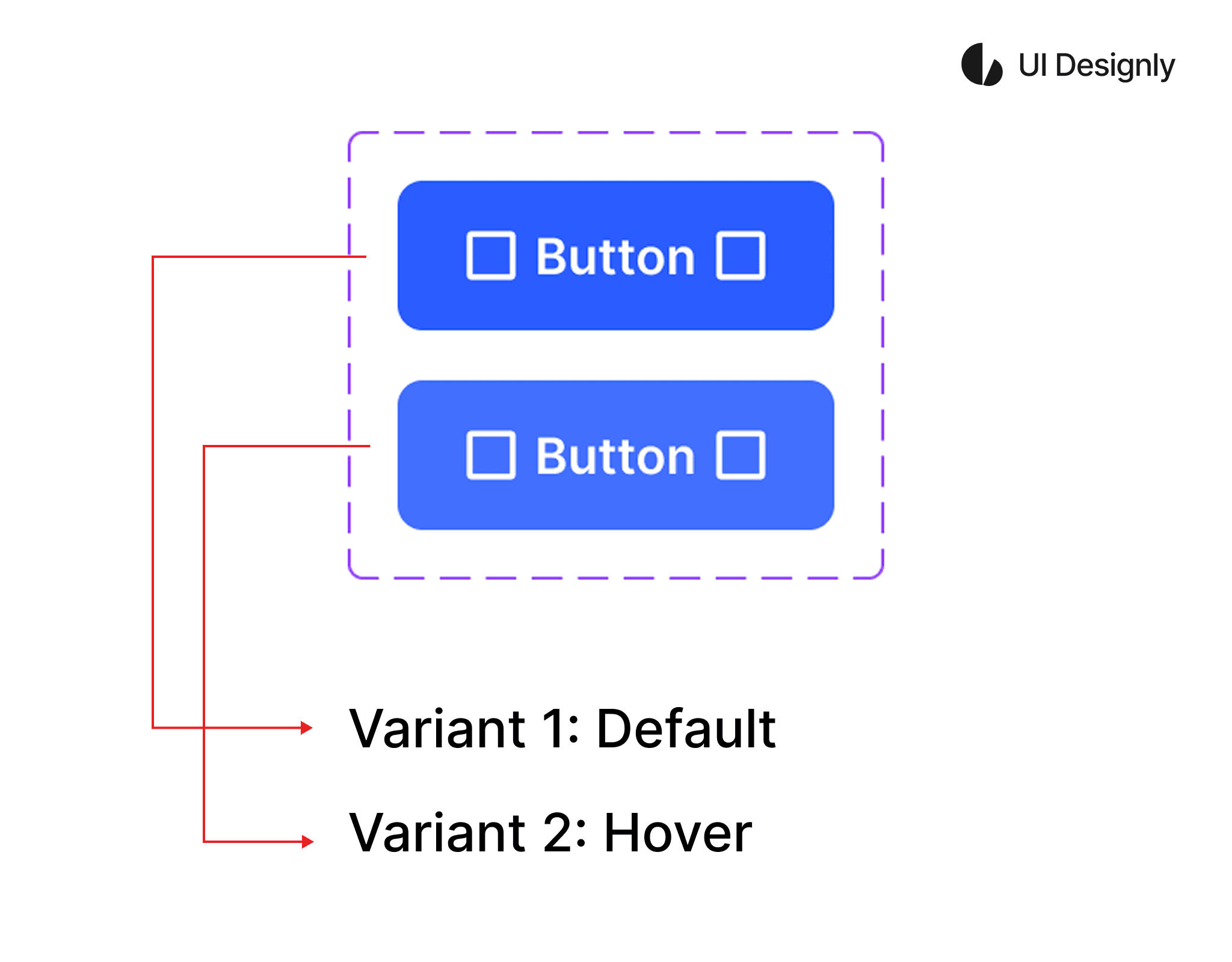 After naming the 2 variants, I have a button component with 2 variants: "Default" and "Hover" as shown. You can create multiple variants for the component to use in your project.