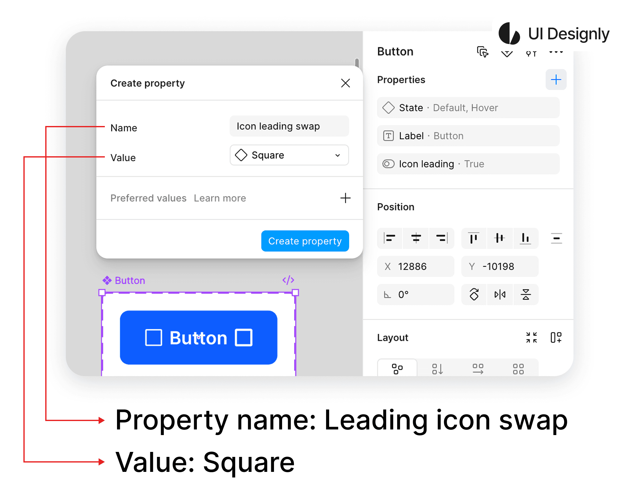 Next is the “Swap Instance” feature. To create it, click on the “+” icon as shown, then select “Swap Instance” and the “Create Property” panel will appear. I name it “Icon leading swap”, and the “Value” is the component value — since I set a placeholder for the icon, I choose “Square”. Finally, click the “Create Property” button to finish.