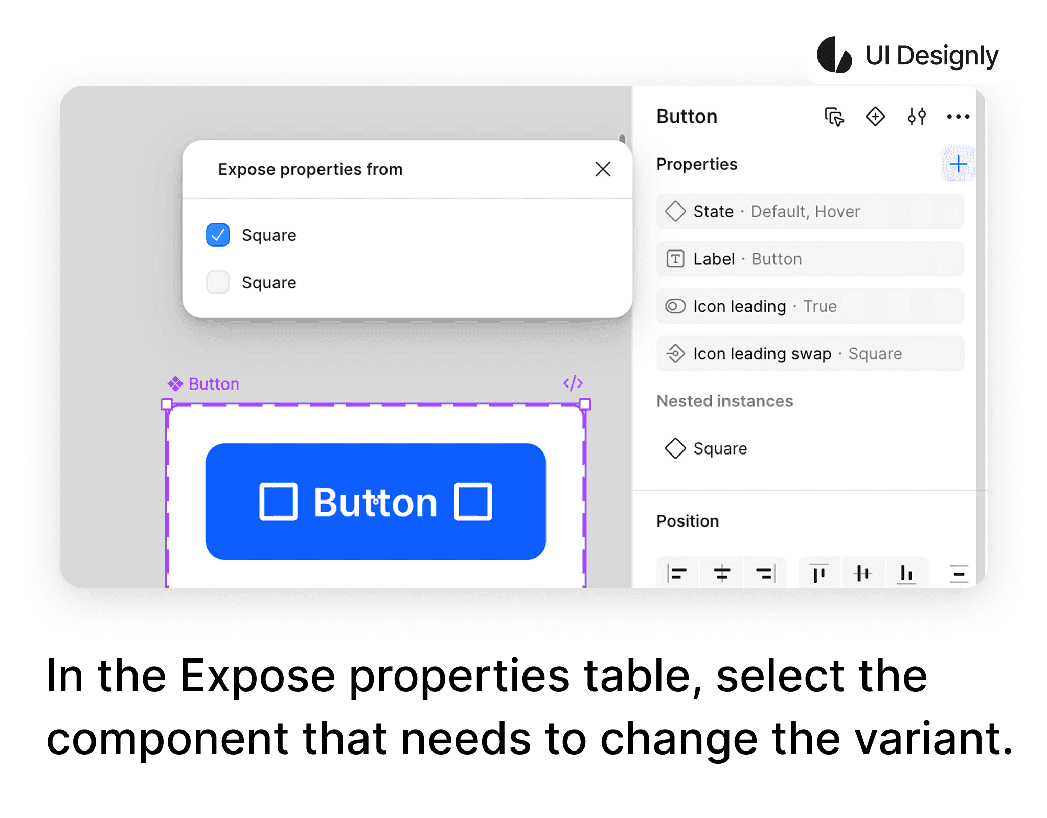 To use the “Nested Instances” feature, first click on the “+” icon as shown, then select “Nested Instances”. The “Expose Properties From” panel will appear with a list of components to expose — here I select the first “Square”, corresponding to the leading icon.