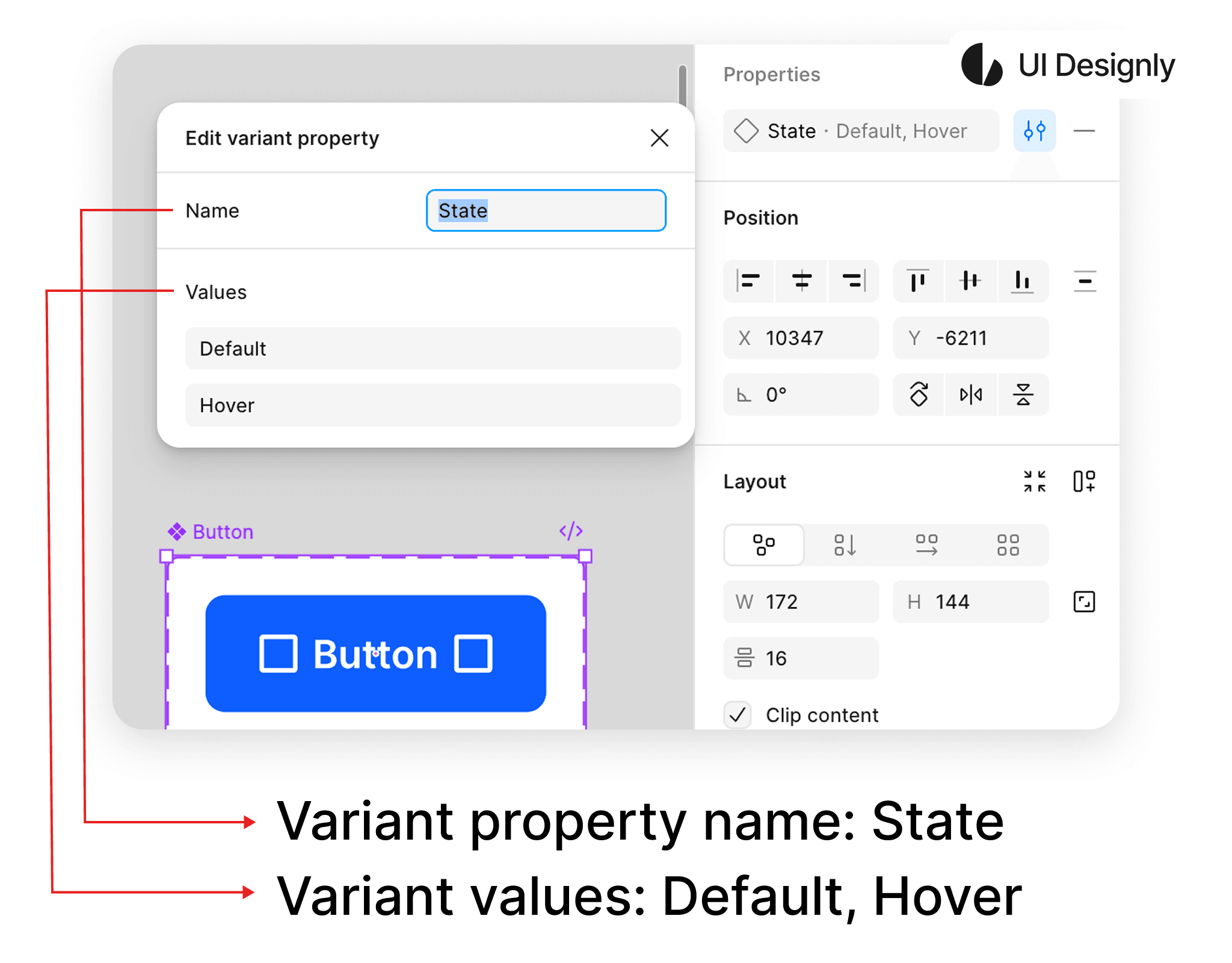 In the example below, I use a "button" with 2 "variants" as an illustration. After creating the 2 variants, Figma will automatically display the "variant property". To edit the "variant property", click on the "Edit" icon as shown, then the "Edit Variant Property" panel will appear. At the top is the name of the property — here I rename it to "State". Below are the values of the property — here I set them to "Default" and "Hover".
