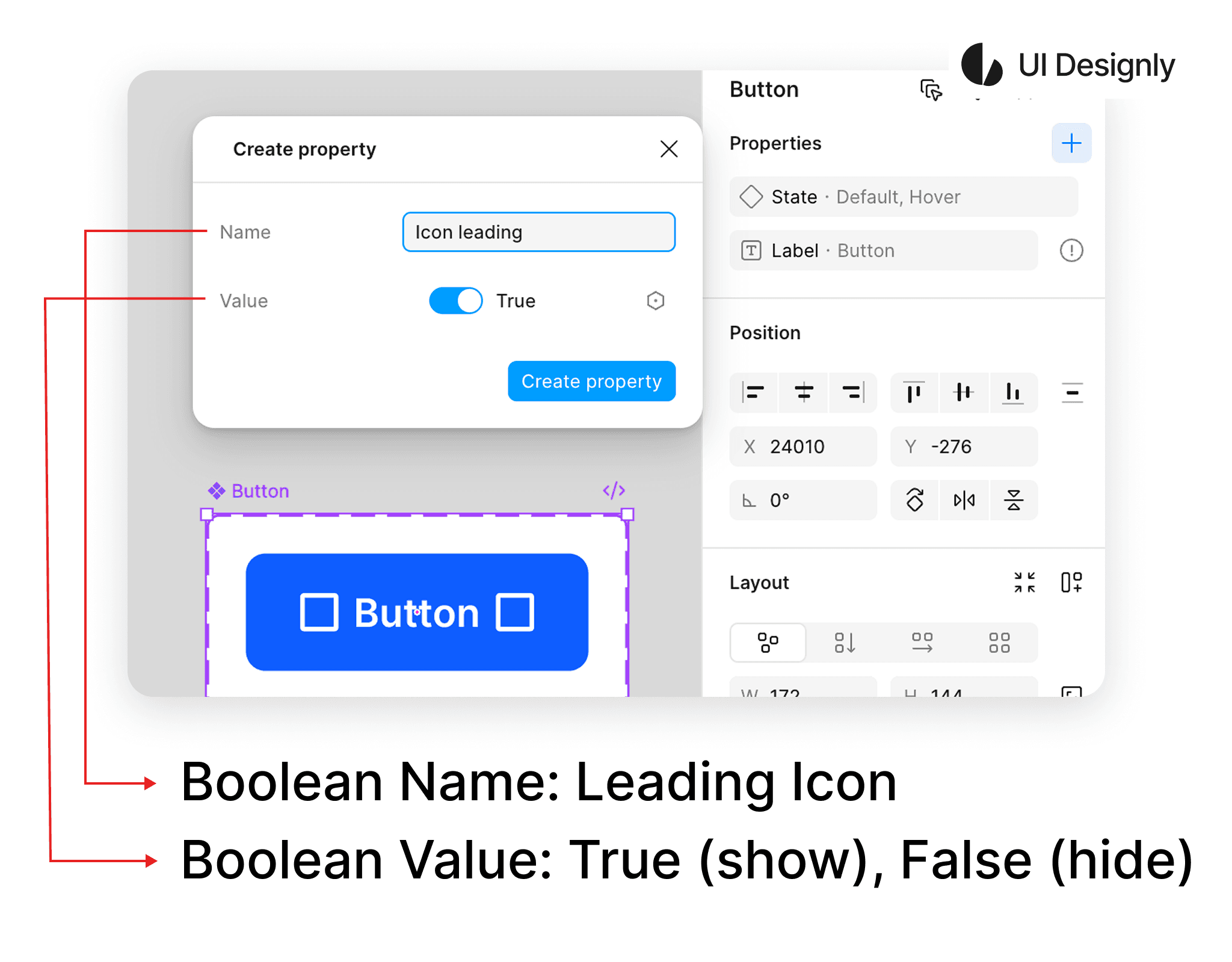 Next is how to create a Boolean for the component. First, click on the “+” icon as shown, then select “Boolean”. The “Create Property” panel for Boolean will appear as shown. I name the Boolean “Icon leading”, and below are the “Value” options: “True – On” to display the element or “False – Off” to hide the element. You can toggle this based on your needs.
