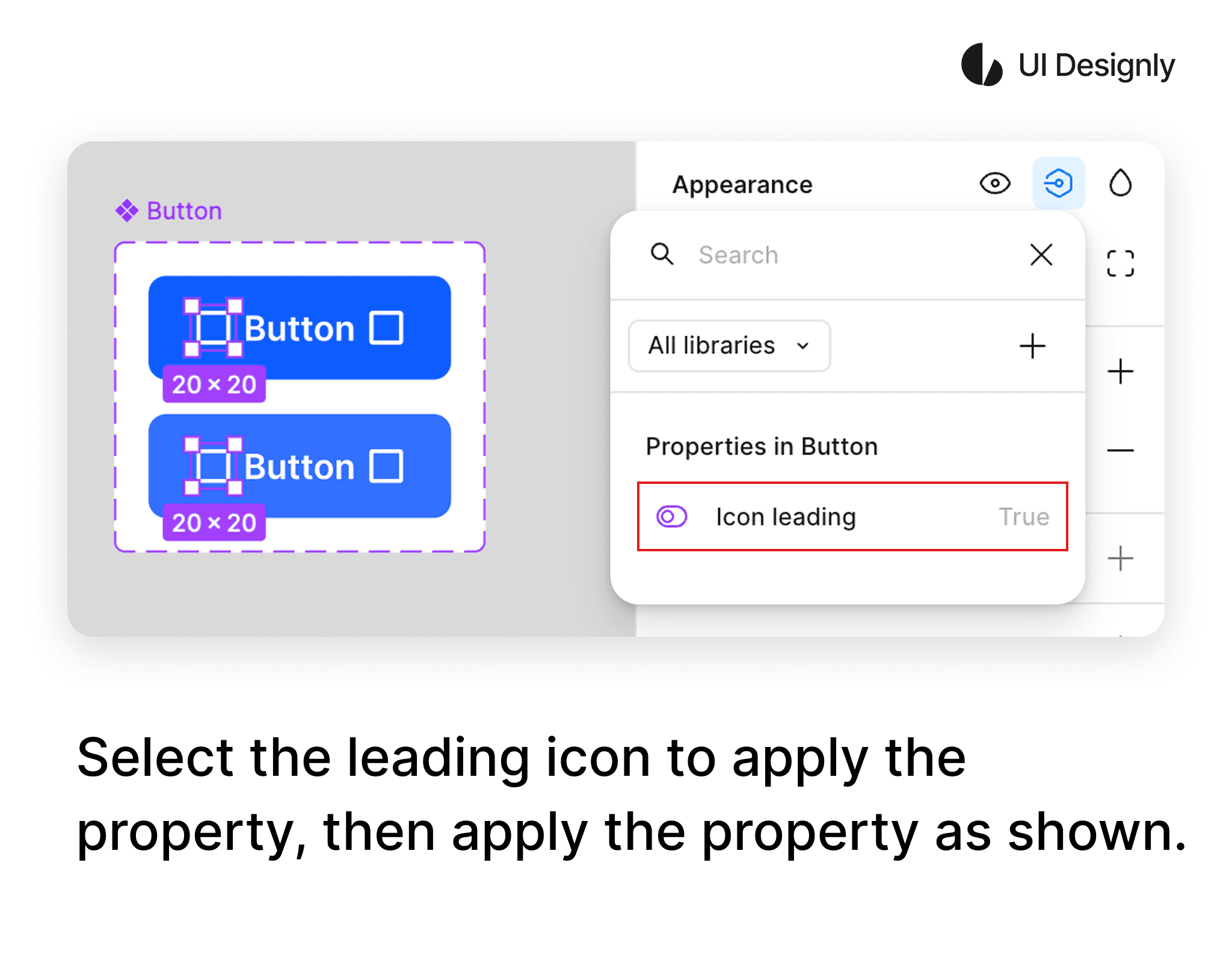 To apply the Boolean to the Icon leading, first select the icons you want to apply as shown. Then, in the Appearance panel, click on the “Apply Property” icon, and the list of button properties will appear as shown. Finally, select the corresponding property to finish.