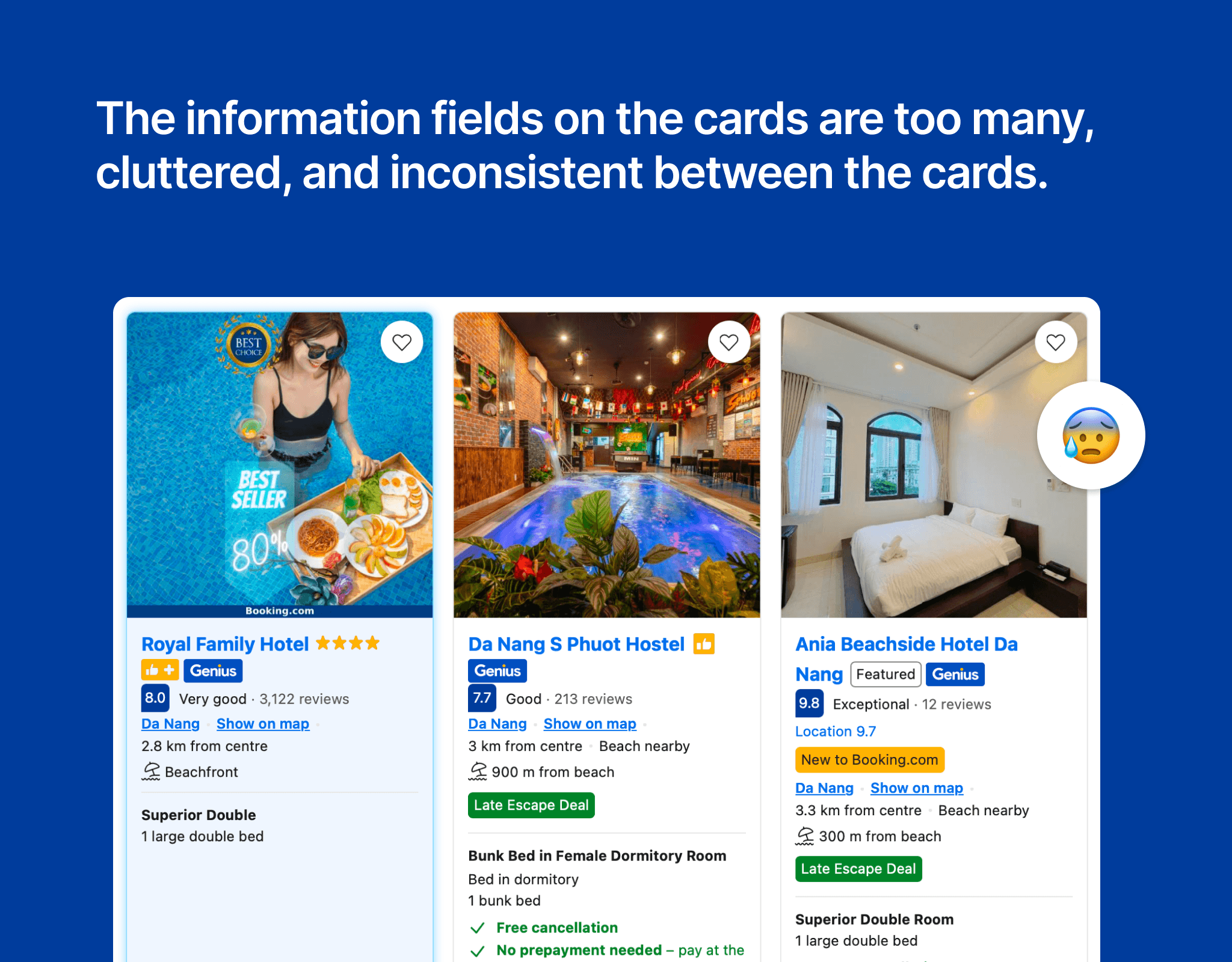 Looking at the three hotel cards in the image, one major issue is immediately apparent: too much information is crammed into a small space, making it easy for viewers to get confused and hard to make decisions. The cards are inconsistent in presentation: each one displays information in a different order, and the icons and colors are not synchronized. Some cards emphasize ratings, others highlight deals, while others add a slew of labels like Genius, Featured, New to Booking.com... This inconsistency makes the experience of browsing the list exhausting. Instead of helping users choose quickly, the redesign forces them to decode each card. This is a prime example of how "more" is not always "better" – especially in interface design, where neatness and prioritization of important information are key.