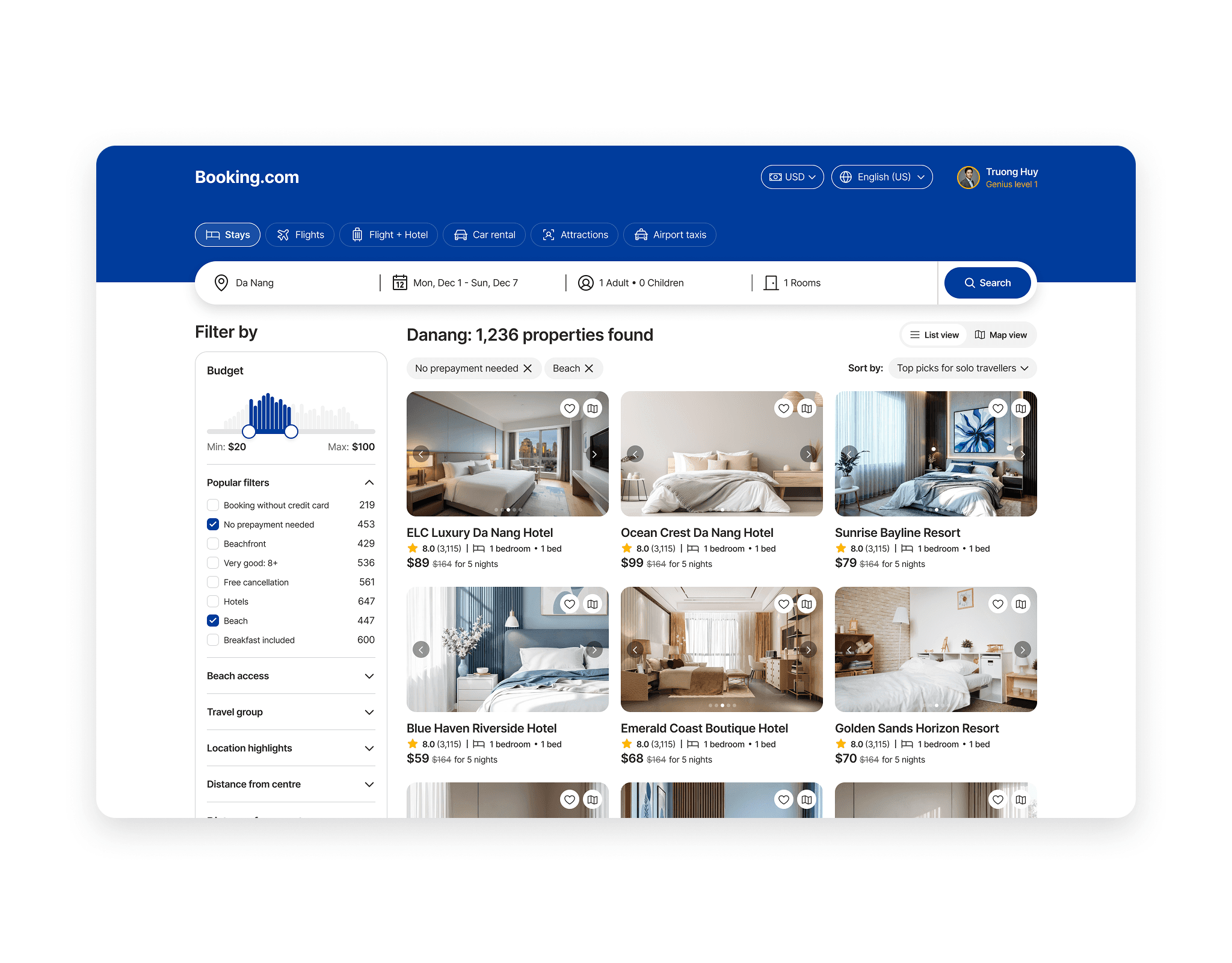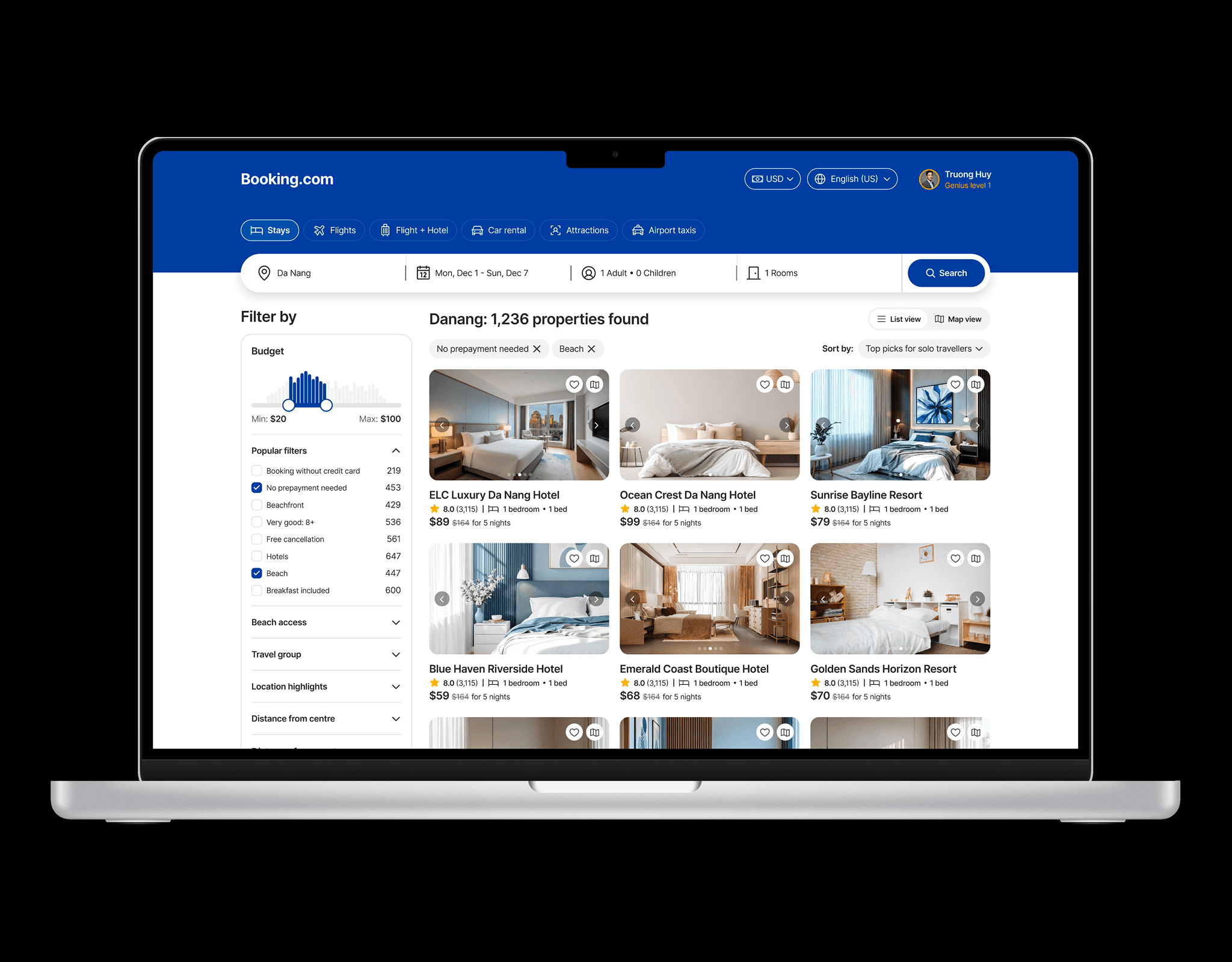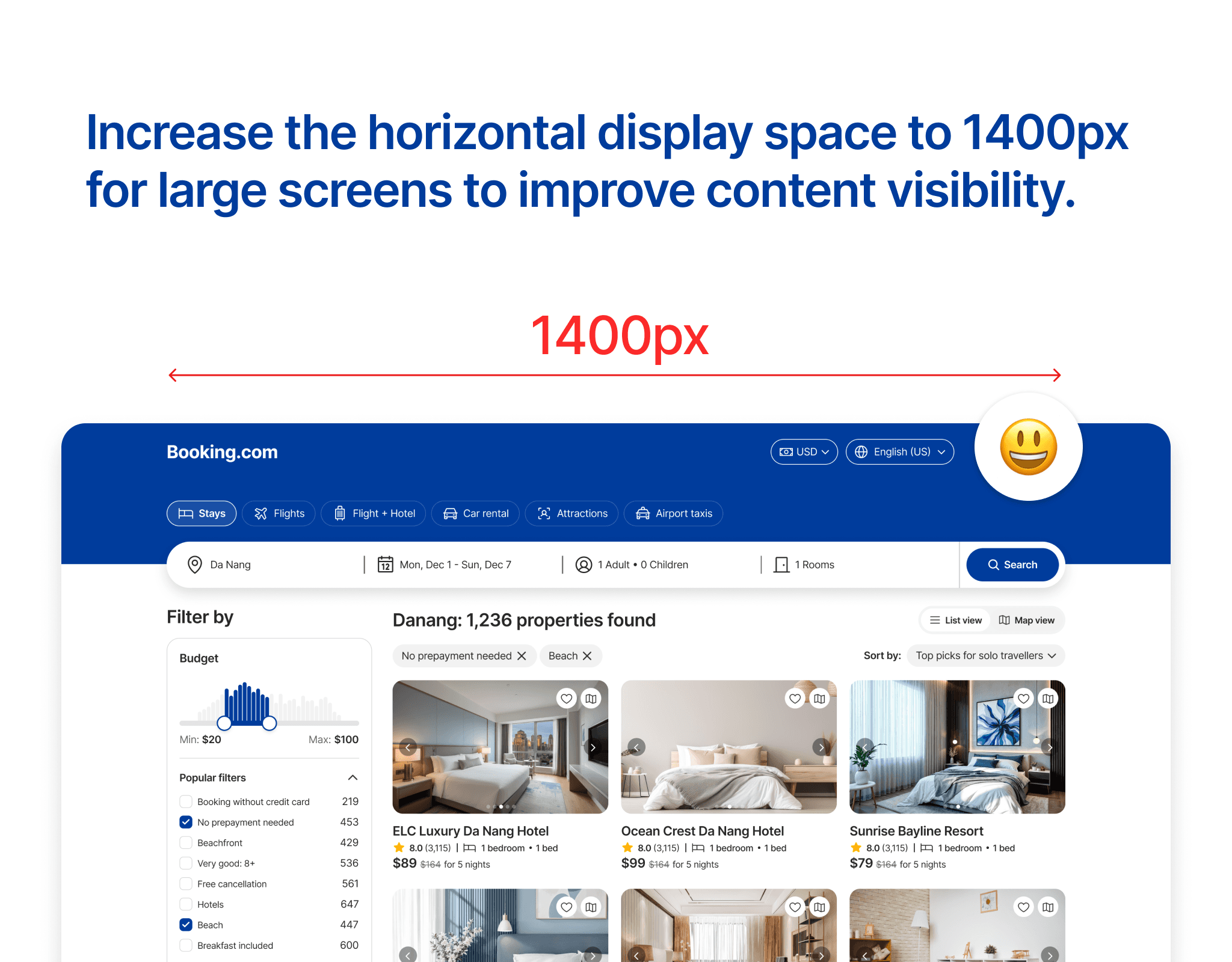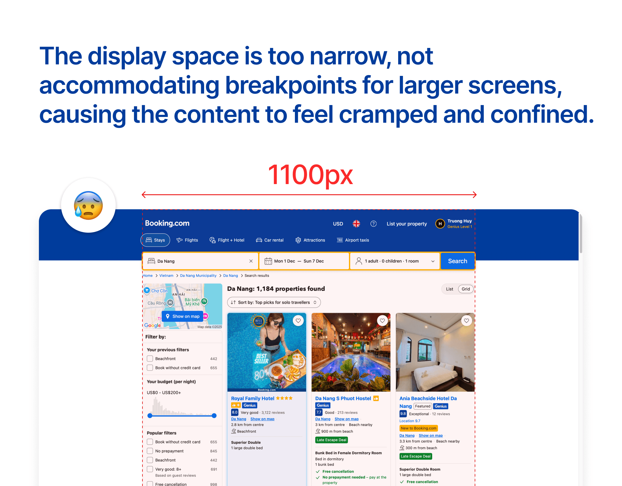 Booking is the world's leading travel platform, but their website is really poor in terms of design. In this article, I will analyze the flaws of the room search screen of this platform and how I would fix it. As you can see on the large screen, they set the content width to only 1100px, which makes the content narrow while there is too much whitespace around that is not utilized to display content.