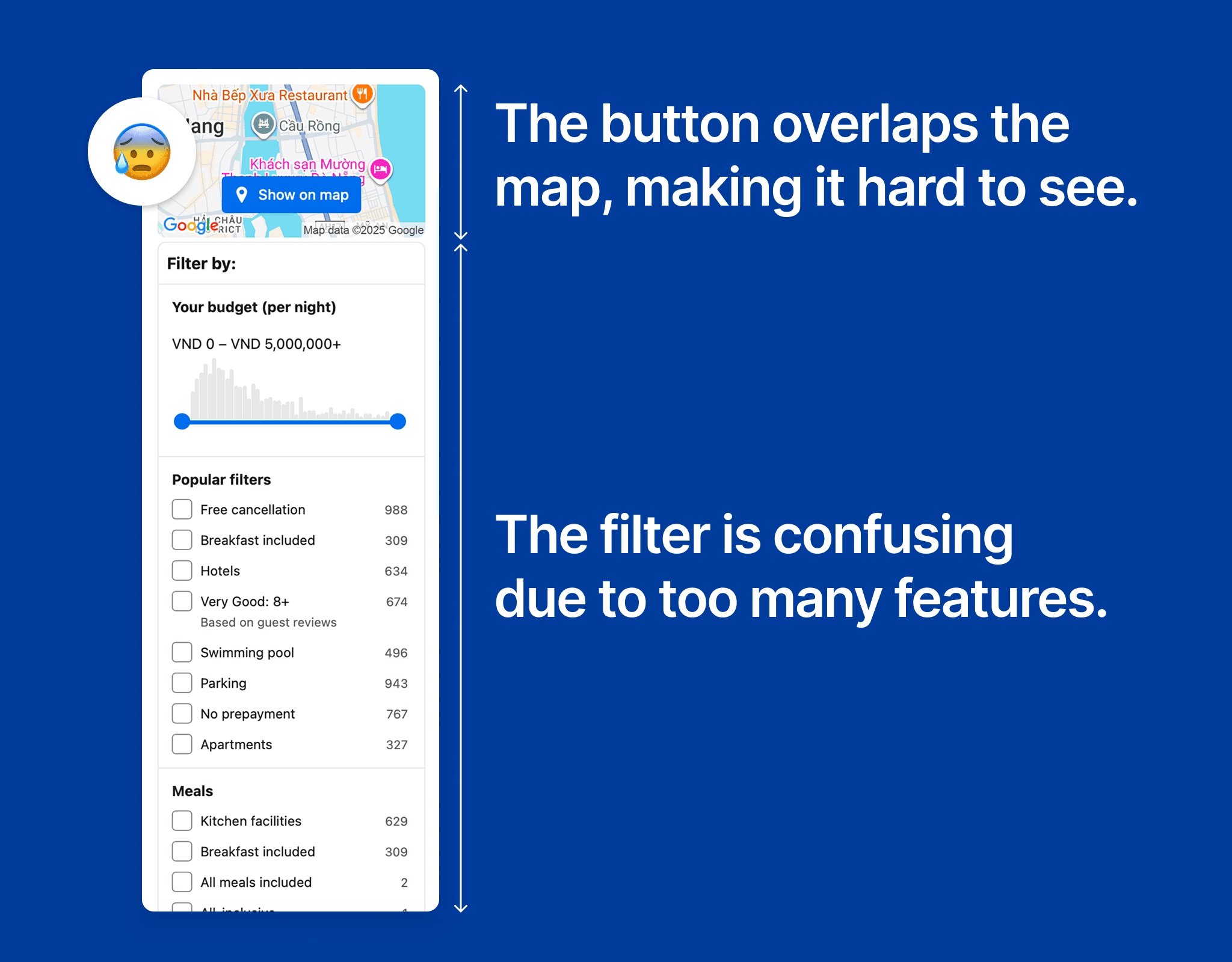 In the filter section, the biggest issue lies in the layout and complexity. Right from the start, the "Show on map" button is overlaid on the map, making it difficult for users to observe the hotel locations. This diminishes the value of the map – which is a key element that helps users make quick decisions. Just below, the filter table stretches with countless options, making the interface feel heavy. Each group of criteria appears continuously without clear prioritization, overwhelming new users. Instead of aiding in narrowing down results, the current design makes the filtering process slow and exhausting. This is a classic example of how too many features do not equate to a good experience. What users need is a streamlined, clear filter that focuses on the most important choices.