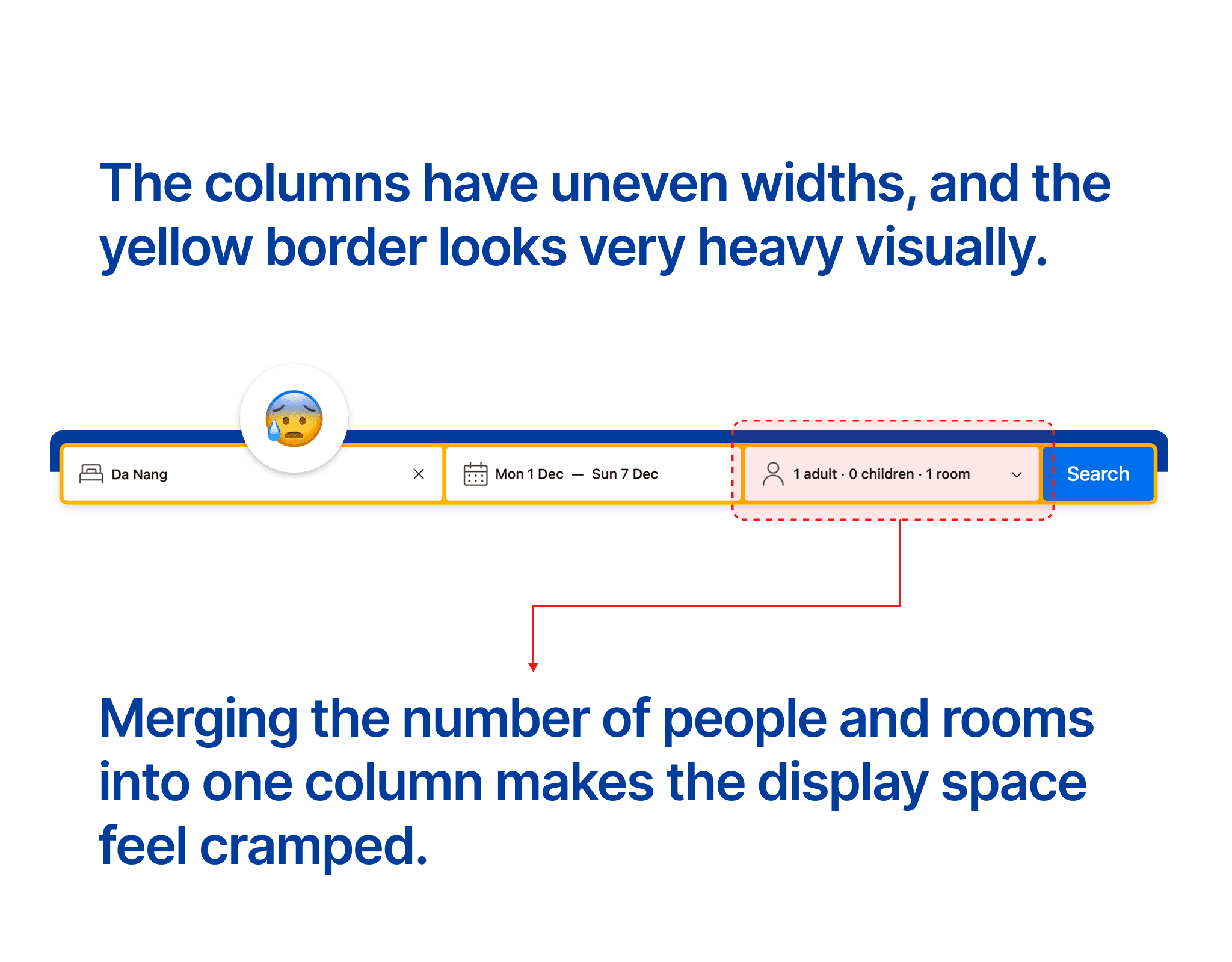 Using yellow borders for the information columns creates a heavy visual feel. There are three information columns: Location, Time, and Number of People + Number of Rooms. However, the widths of the columns are uneven; the Location column is significantly larger than the other two, leading to a lack of consistency in design. Furthermore, combining Number of People and Number of Rooms into one column makes it difficult for users to track the information.