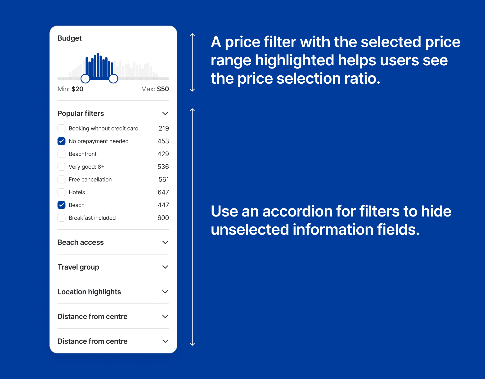In this filter column, I have adjusted it to optimize the design. In the Budget section, when users select a price range, the selected part lights up in green, helping users grasp the volume of users choosing this price range. Next, in the filter section below, I used an accordion to hide subcategories and only display the selected item, making the filter look clearer and reducing reading pressure on users' eyes.