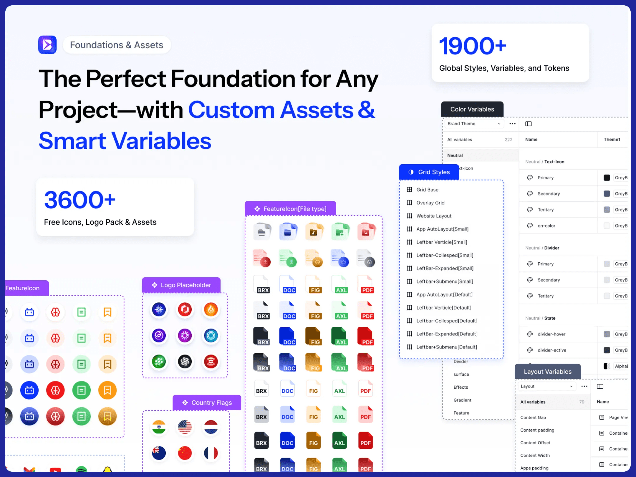 Around 1,900 global styles, variables, and tokens, plus 3,600 icons and logos that make customization easy and consistent.